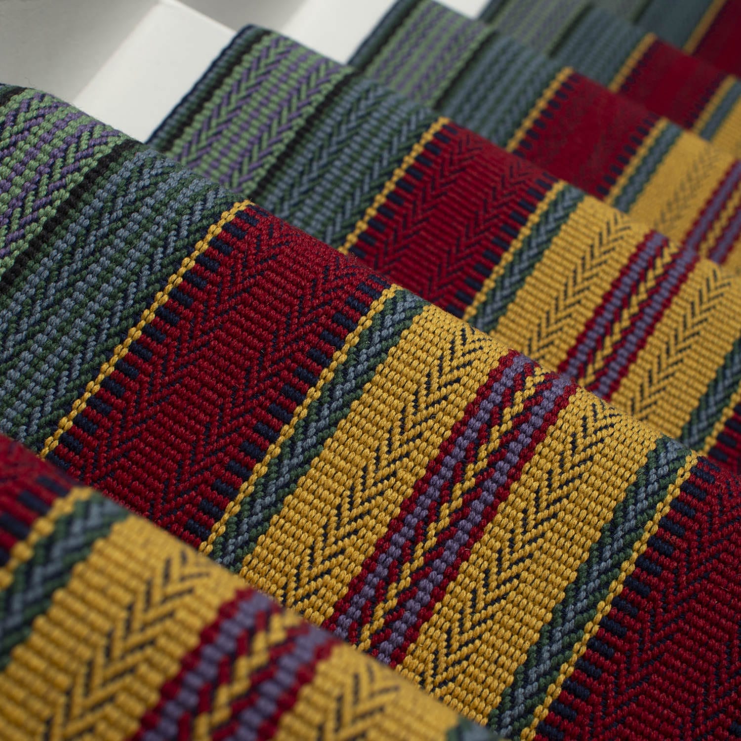 Originally designed in 1989, now woven in a contemporary herringbone structure. The multi-stripe pattern is a single repeat which makes a statement when used in a single width or seamed together.