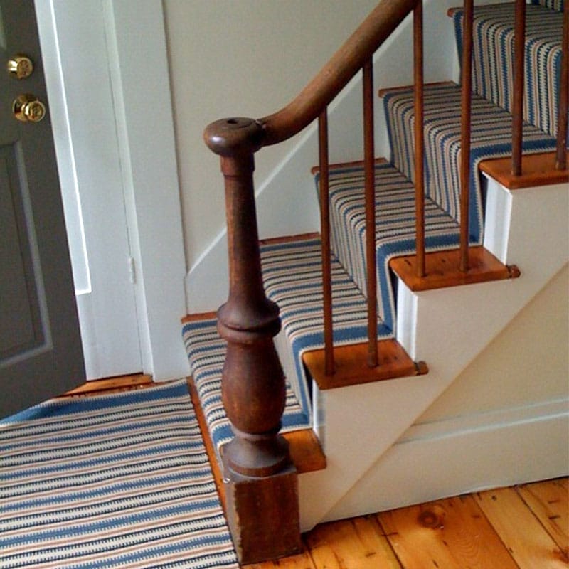 Urbane Living have a range of a 100% wool flatweave runners available to view in our London showroom. The wool is spun and dyed in Yorkshire, and woven on looms in Somerset. The bespoke range has a variety of designs to choose from, and can be customised to various widths and colours. They are suitable for stairs and landings, and can be seamed to create continuity in the design around areas such as landings.